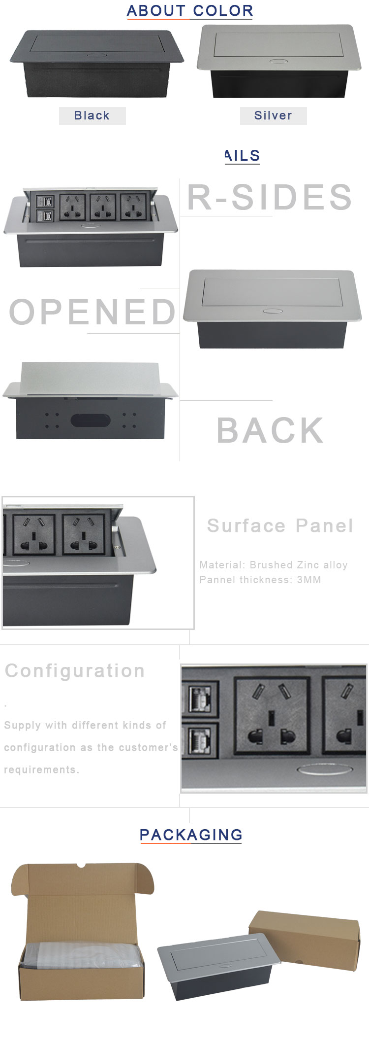 This socket normally mount on the table and all connectors and hidden under the surface zinc alloy panel. Could save more space and keep table integral and conforming. To supply a fashion and modern environment for office and meeting room.