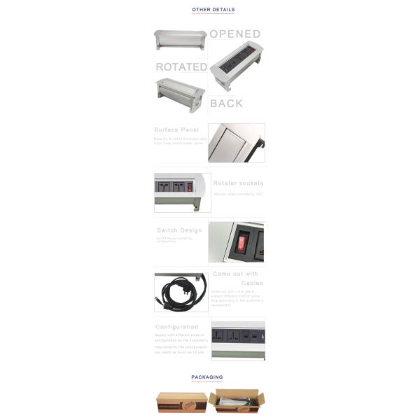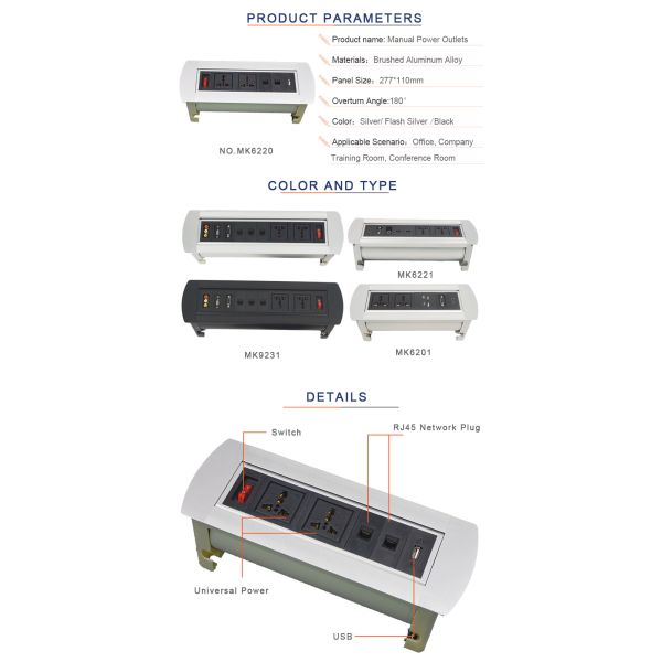 MK Series rotatable tabletop socket is mainly used in advanced office, hotel and home, training room, lecture room. Tabletop socket could be used with other installation surrounding together. When power with the desktop power socket, the indicator light is power on, product come to working station. Press the up/ down switch, all the multi-functional sockets could be rotate 180 degree to whatever position as needed. All configuration on desktop socket could be hidden under table if unused and would be rotating into the tabletop by automatically.